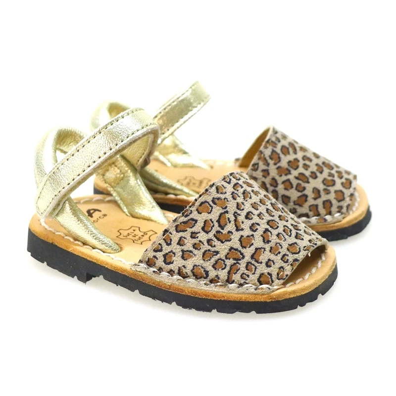 Menorquina para bebé primeros pasos y niña de RIA con la pala en piel de nobuck con gotal y pulsera en piel metalizada y en piel de nobuck con estampado animal print. Cierre de velcro alrededor del tobillo para mayor sujeción. Forros y planta en piel con logo de la marca. Suela de caucho de neumático. Disponible en diferentes colores, piel de nobuck maquillaje combinada con piel metalizada oro rosa y piel de nobuck estampado de leopardo. Consejos de talla: Calzan el número. Las menorquinas son un básico imprescindible en verano ya que combinan con todo y es el mejor calzado para alternar con las sandalias. RIA cuenta con más de 60 años de trayectoria, de empresa familiar que ha logrado convertir el calzado tradicional de la isla en un producto de moda.
