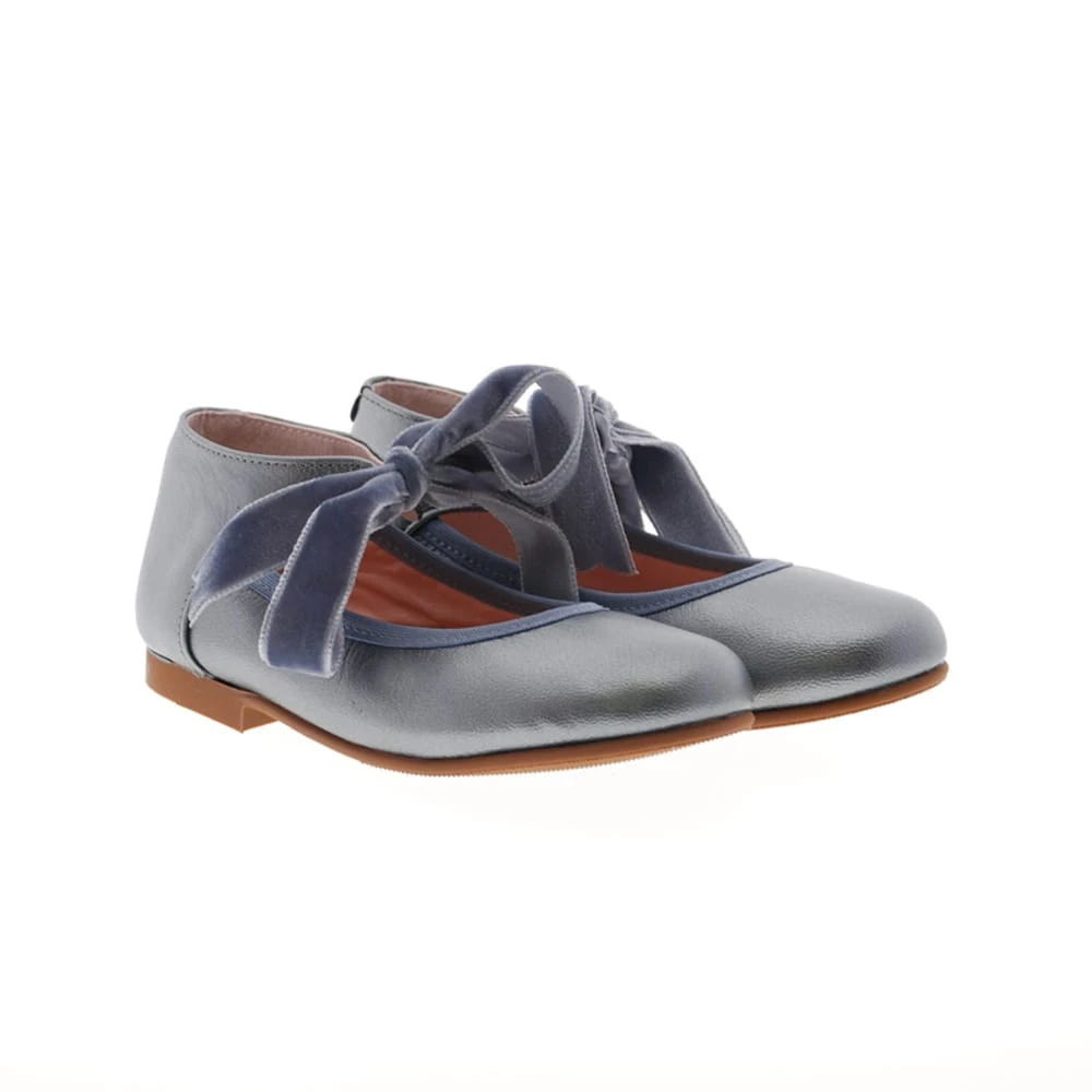 Mercedes con lazada en piel metalizada con terciopelo para vestir. Forros y planta en piel. Suela de goma antideslizante.
