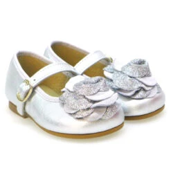 Piel napa metalizada plata con coca en nobuck gris y glitter plata. Consejos de talla: Calzan el número. Viste los pies de tu bebé en las ocasiones más especiales con estos zapatos de ceremonia y combínalos con vestidos.