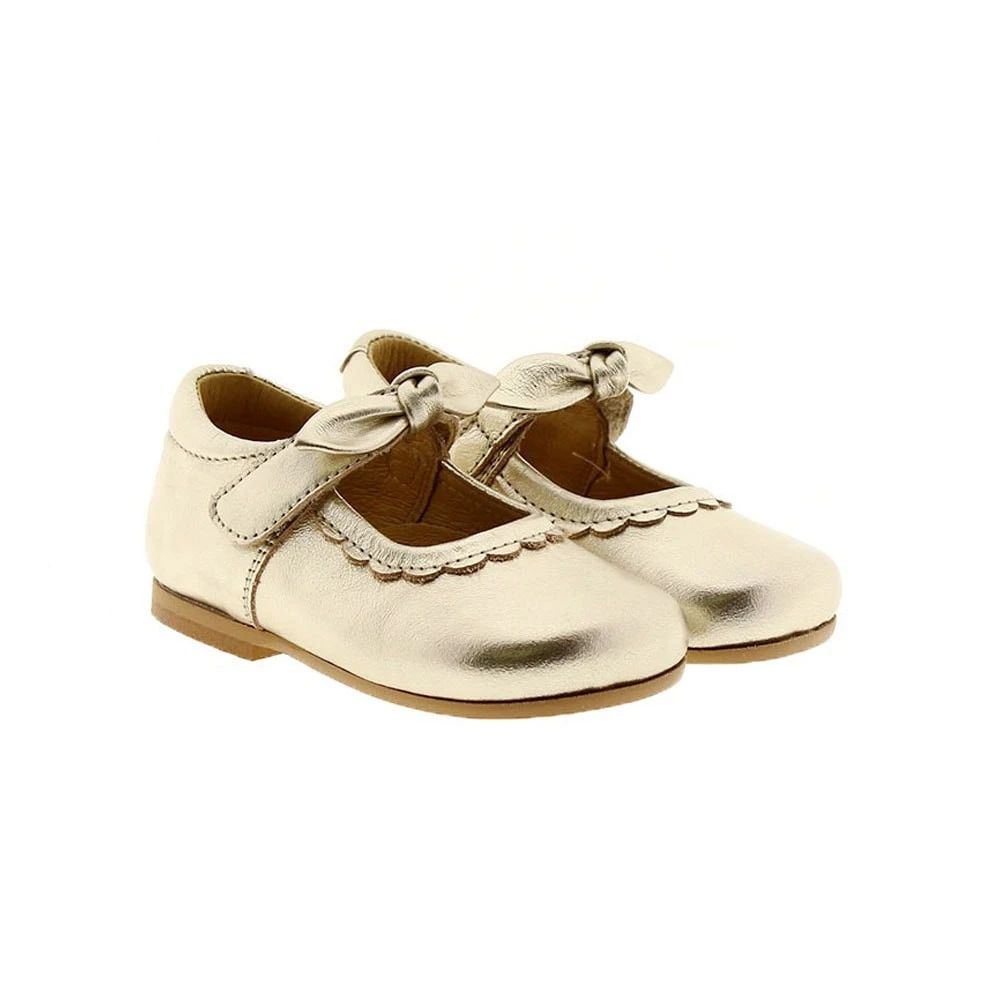 Esta primavera, vestiremos los pies de tu pequeña en sus primeros pasos, con estos zapatos tipo merceditas en piel metalizada. El cierre es de velcro y en la tira del empeine lleva de adorno un lazo que se puede poner y quitar. El interior es de piel con formativo para el correcto desarrollo del pie y la suela antideslizante.