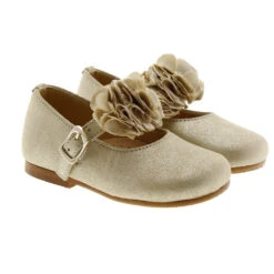 Disponible en diferentes colores, piel metalizada rosa y piel metalizada oro. Consejos de talla: Calzan el número. Un zapato ideal gracias a las flores para las ocasiones más especiales. Con este zapato irán a juego de sus hermanas mayores el día de su comunión o en cualquier otro evento. Es ideal para vestidos de ceremonia, aunque le podrán sacar el máximo partido, llevándolo el resto de la temporada con vestidos más informales o con unos pitillos y una camisa para el fin de semana.