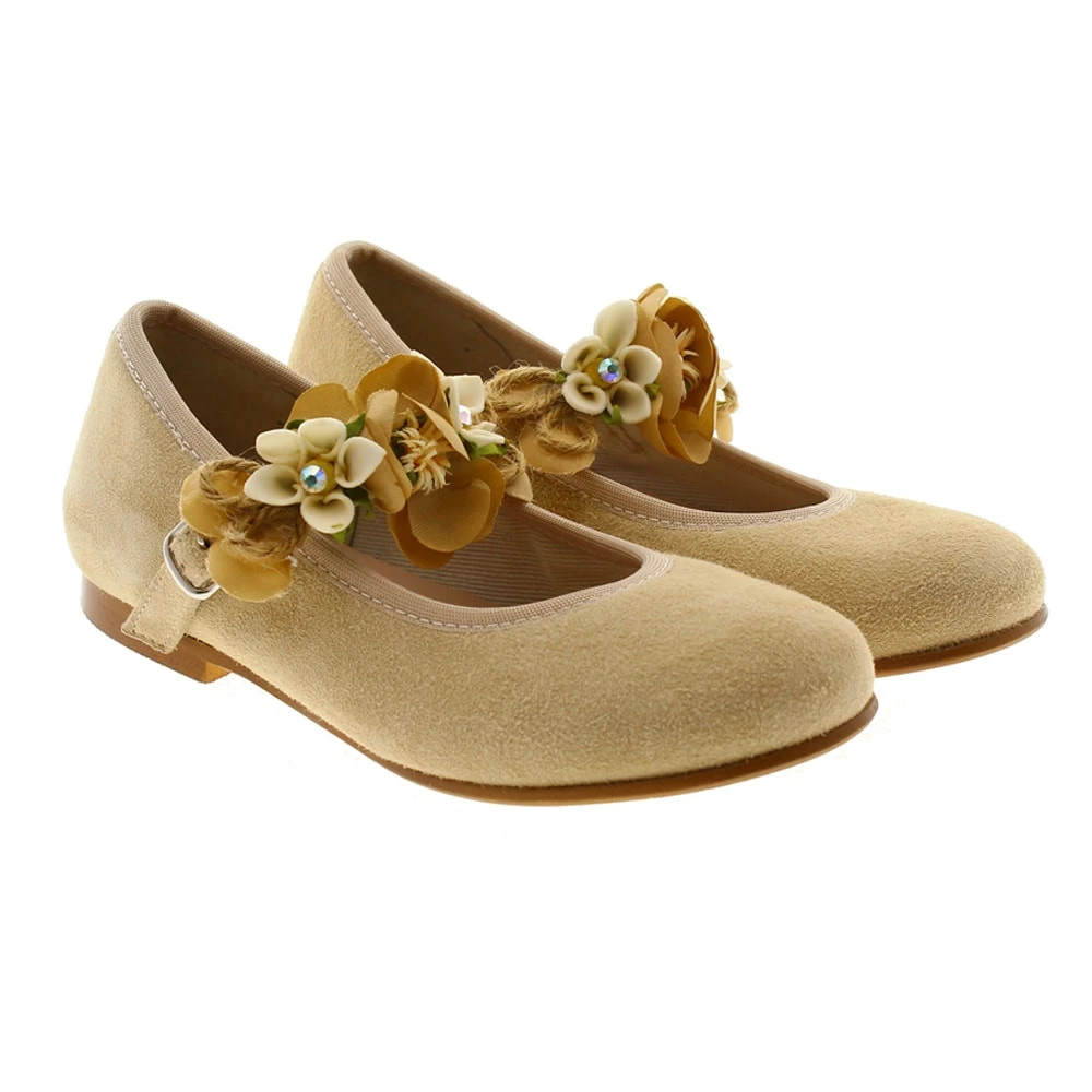 Merceditas para ceremonia de OCA LOCA para niña en piel de nobuck con tira en el empeine adornada con flores y strass. Cierre de hebilla. Forros y planta en piel. Suela de goma antideslizante.