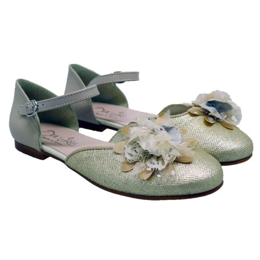 Color oro. Consejos de talla: Calzan el número. Última tendencia en zapatos de comunión, la mezcla del lino, los tonos metalizados y las merceditas abiertas. Un zapato ideal para vestidos con fajines o tocados a juego.