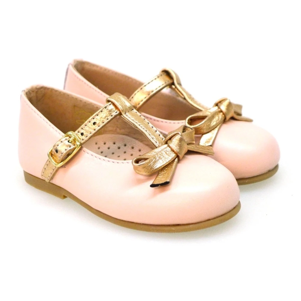 Los zapatos florita se caracterizan por tener doble tira en el empeine en forma de T proporcionando mayor sujeción. Este modelo está hecho en piel napa con las tiras en piel metalizada y adornado con un lazo en la pala y en piel polvorone con tira en el empeine y lazo en nobuck. El cierre es de hebilla para ajustarla a la anchura del pie de la niña. El interior es de piel transpirable con formativo en la planta y la suela de goma antideslizante.