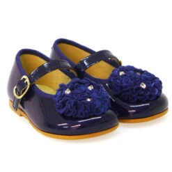 Zapato merceditas con cierre de hebilla. Fabricado en charol. Adorno en forma de coca con incrustaciones de cristal. Piso flexible antideslizante en crepelina caramelo. El efecto es el de una bailarina pero sujeta, de esta forma les permite la sujeción adecuada para que puedan caminar de la forma correcta.
