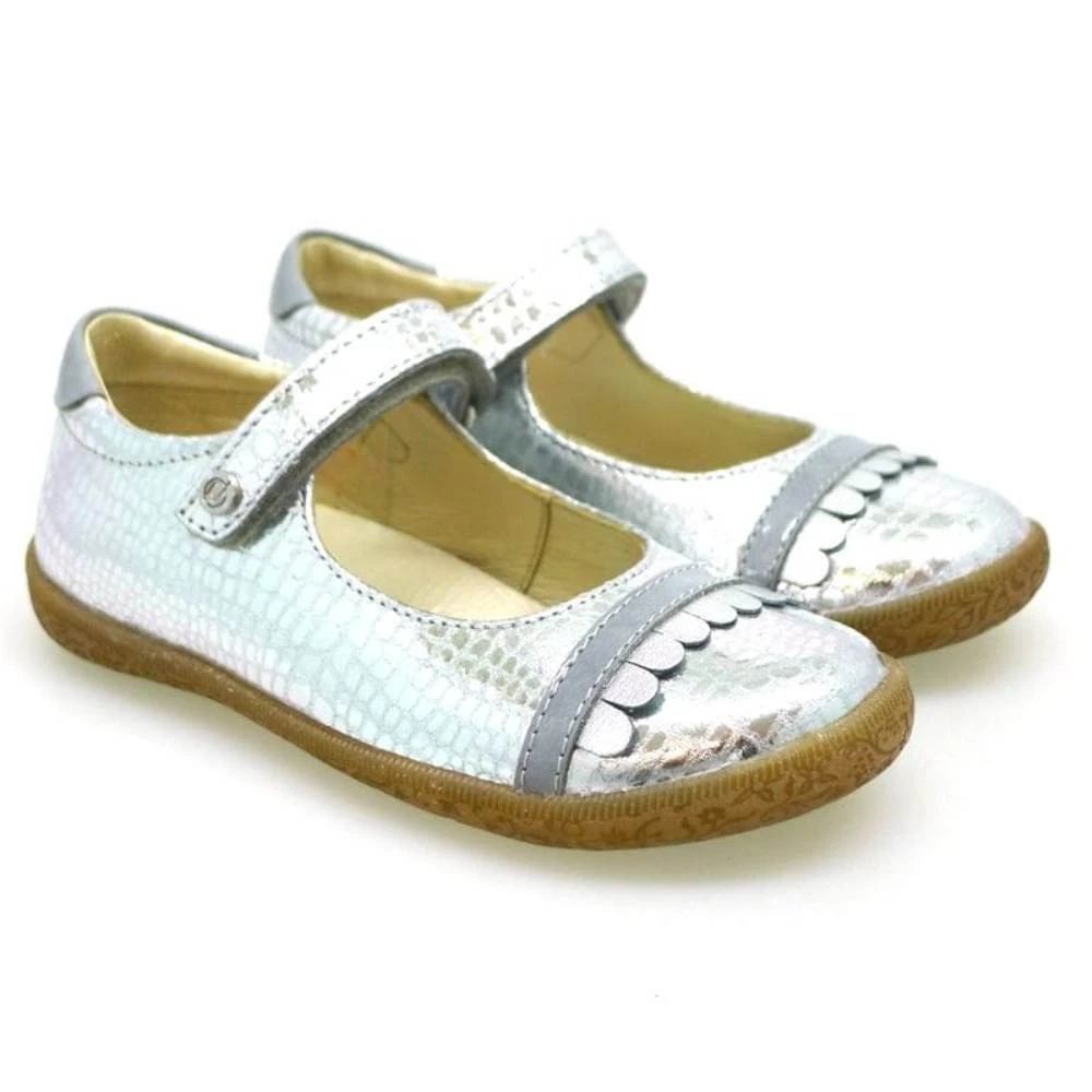 Merceditas de niña de sport en piel metalizada y en piel de charol de NATURINO. Cierre de velcro con adorno de flecos en la pala. Forros y planta anatómica en piel. Suela de goma antideslizante.