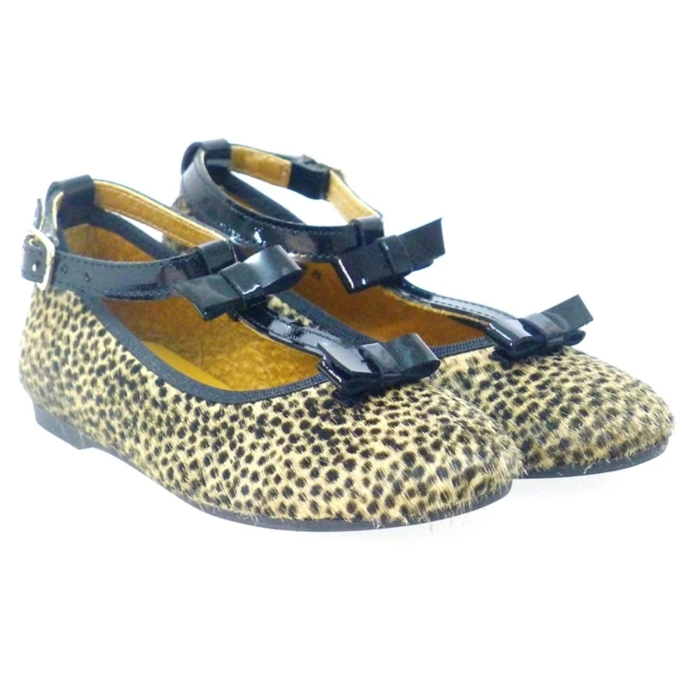 Mercedes tipo zapato sandalia con cierre de hebilla, en pony de estampado leopardo. Tira del empeine y hebilla en charol con adorno de lazos. Forro y planta de piel transpirable. Piso de crepe flexible y antideslizante.