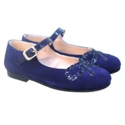 Disponible en diferentes colores, piel nobuck azul, con tira en charol y lazo de glitter en el mismo tono y piel de nobuck gris, con tira en charol y lazo de glitter en el mismo tono. Consejos de talla: Calzan el número. Una merceditas para vestir, combinable con vestidos y pantalones.