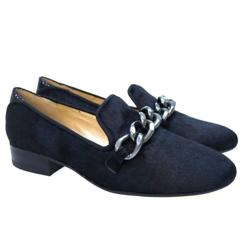 Piel de pony negro, con cadena en plata. Consejos de talla: Calzan el número. Si buscas un calzado plano pero no tan escotado como la bailarina, este mocasín es perfecto para ti. Podrás combinarlos en invierno a diario para ir a trabajar con prendas de vestir como una falda midi y una camisa o pantalón y lazer. El toque original se lo da la cadena.