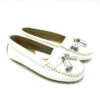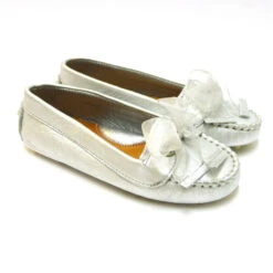 Piel napa metalizada en plata, lazo al tono.Consejos de talla: Calzan el número, pero para este tipo de calzado se recomienda no cogerlo muy grande ya que la piel tiende a ceder.Un mocasÃn que podran tener las niñas y las mamas, gracias a su amplia numeración.