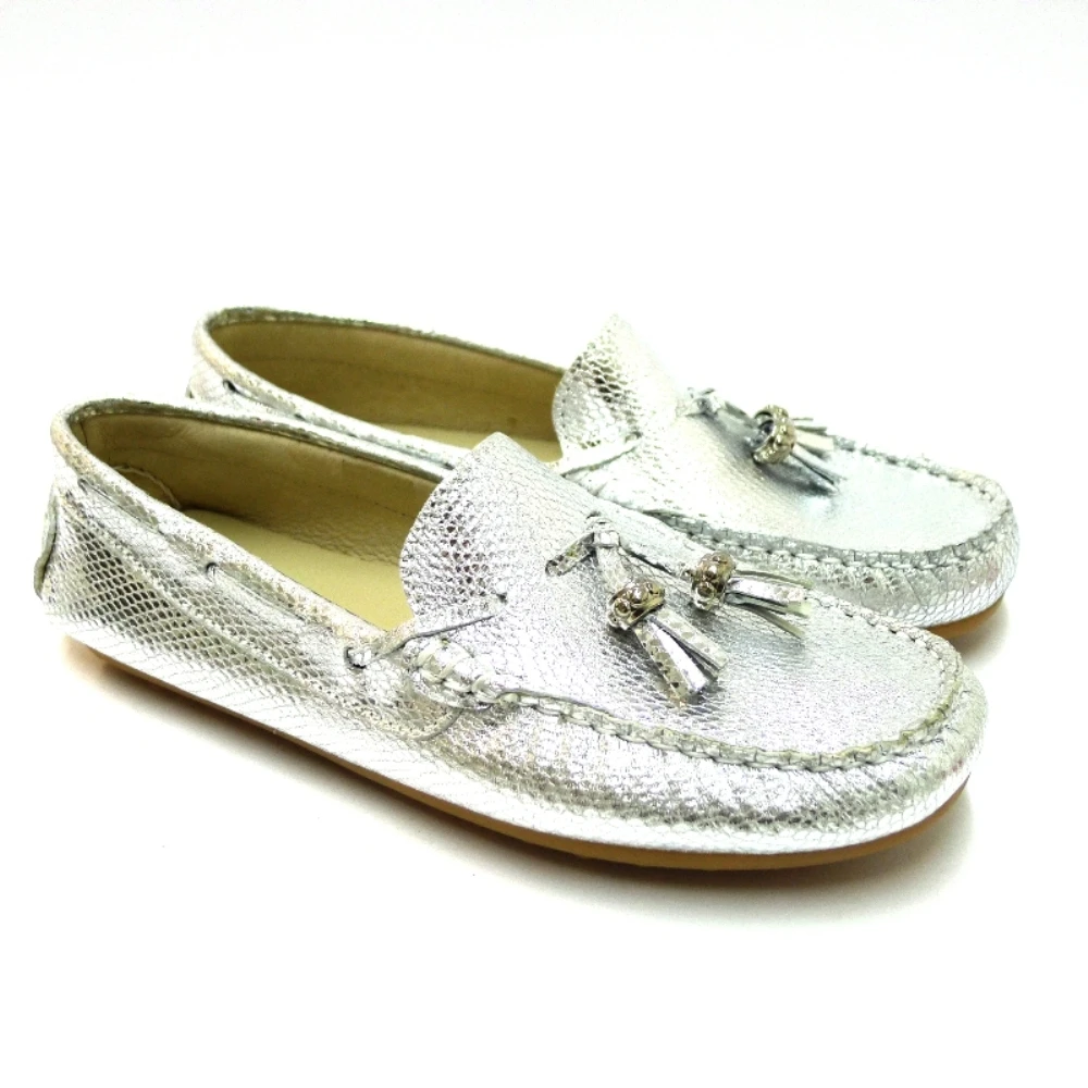MocasÃn de niña en piel metalizada escamada, con adorno de borlas y terminares en niquel. Forro y planta de piel. Suela gomini ligera y flexible.