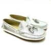 Mocasín tipo castellano en piel de charol, con adorno de estribo en la pala. Forros y planta en piel. Suela de goma antideslizante.