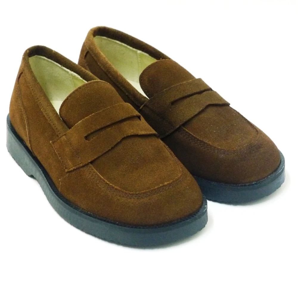 Piel en ante hidrofugado inglés marrón.Consejos de talla: calza el número. Los mocasines son un básico en el armario de un niño, sobre todo para vestir y para ocasiones especiales. Este modelo es de horma ancha y con puntera cuadrada para que vayan cómodos y bien calzados sin que les opriman en los dedos ni les roce. Combínalos en invierno con pantalones de vestir, tanto para una ocasión especial como para el fin de semana.