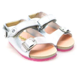 Sandalia de niña para pirmeros pasos tipo bio en piel metalizada lame de NATURINO. Cierre de velcro, con adorno de hebilla ajustable en la pala y talón. Forros y planta en piel con formativo. Suela de goma flexible y antideslizante.
