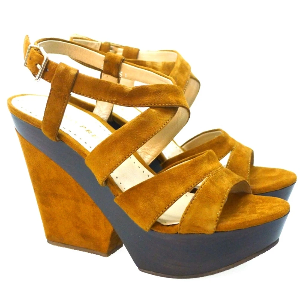 Disfruta de la comodidad de las plataformas y tacón ancho con esta sandalia de la marca italiana BRUNO PREMI. La piel es de nobuck y lleva doble tira en la pala y tiras cruzadas en el empeine, con cierre de hebilla y pulsera alrededor del tobillo. El interior es de piel transpirable para mayor comodidad. El tacón tiene una altura de 10 cm y la plataforma de 3,5 cm aproximadamente.