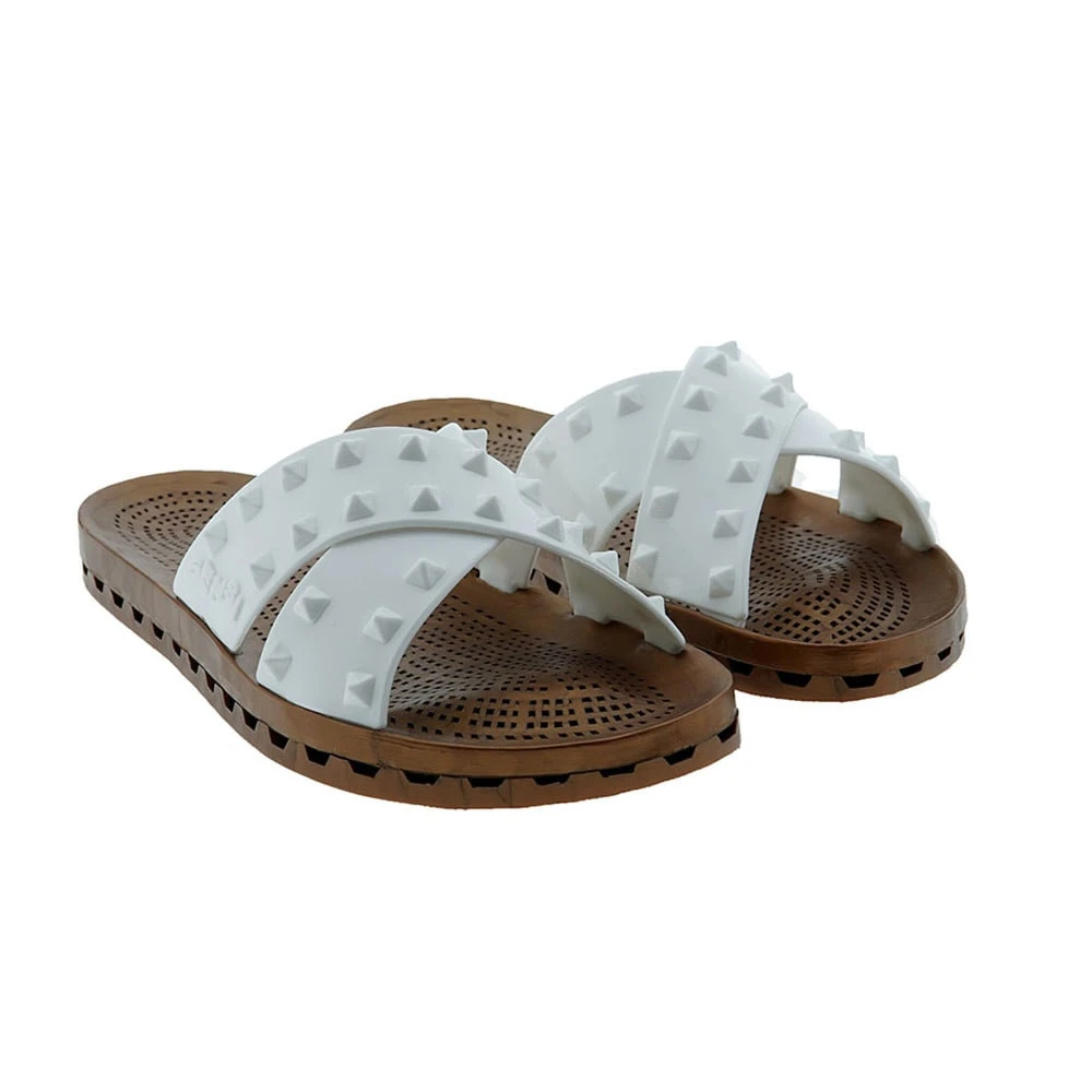Otro tipo de sandalia de agua de la marca SENSI son las palas con doble tira cruzada y a la vez adornadas con pinchos en el mismo tono. La planta es anatómica para que resulten más cómodas al caminar y las suelas muy flexibles y antideslizantes.