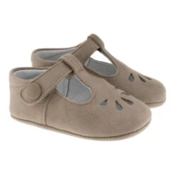 Llega la época de comuniones, ceremonias y de ponerle conjuntos más primaverales a los peques recién nacidos, y el zapato más acorde es este patuco en piel de nobuck tipo pepito. Lleva unos detalles troquelados en la pala y cierre de velcro con adorno de botón. Los forros son de piel muy suave y la suela muy flexible.