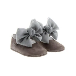 Elige estos zapatitos sin suela tipo badana para vestir. Estas merceditas están fabricadas en piel de serraje con cierre de velcro con una tira en el empeine y de adorno llevan un lazo de gasa. El interior es de piel muy suave y las suelas son muy flexibles.