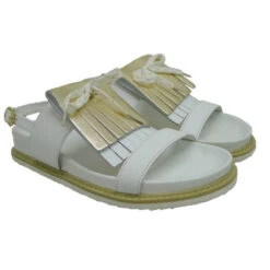 Piel napa blanco con flecos en oro. Consejos de talla: Calzan el número. Si buscas una sandalia cómoda para ir a trabajar y poder combinar con vestidos vaporosos o jeans, este modelo está pensado para ti.