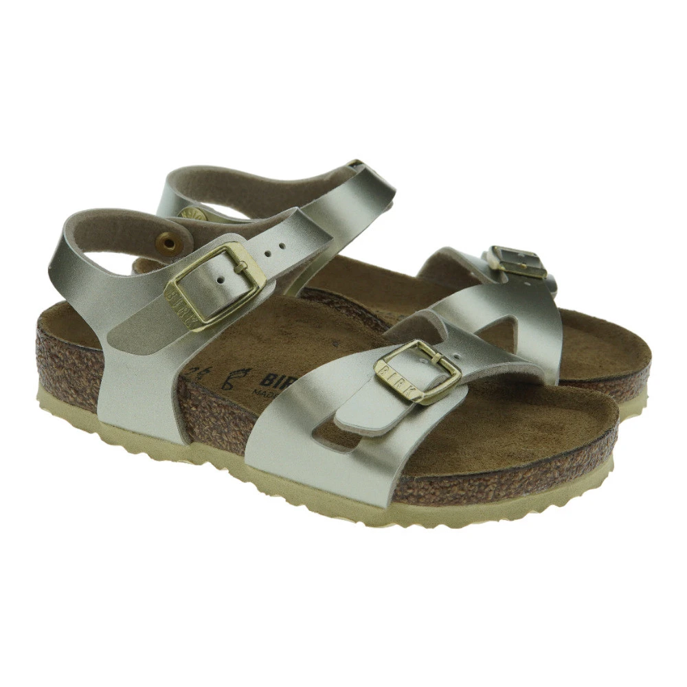 Sandalia bio para niña de BIRKENSTOCK con acabado metalizado con hebillas ajustables en la pala y en el empeine. Forros y planta anatómica en piel. Suela de goma antideslizante.