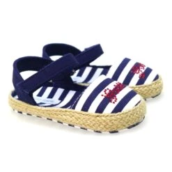 Algodón de rayas blanco y azul, con logo rojo. Consejos de talla: Calzan amplio. Una colección marinera, para combinar con los vestiditos sport más especiales de tu bebé.