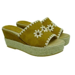 Sandalia con cuña de esparto de TIZIANA con pala en piel de nobuck perforada con adorno de pespuntes. Forros y planta en piel. Cuña de 7 cm y plataforma de 3 cm aproximadamente.