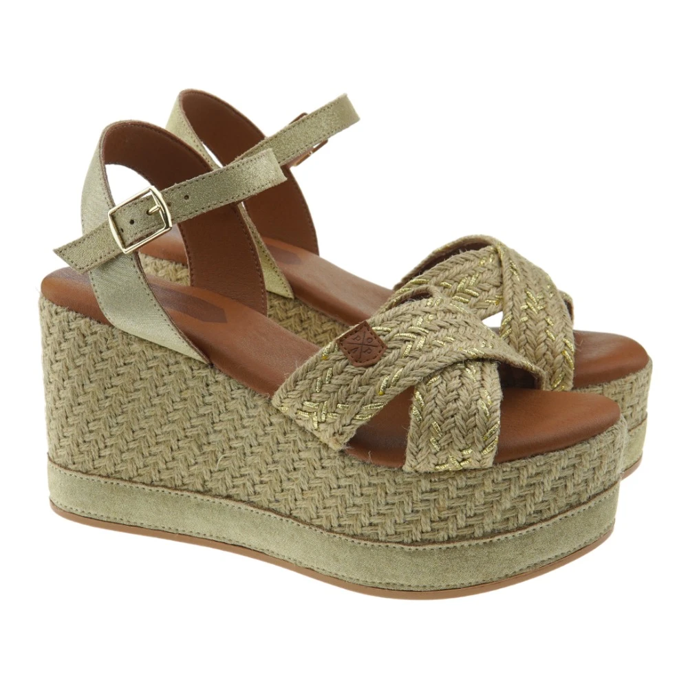 POPA ha lanzado este verano estas sandalias de yute trenzado con cuña alta y plataforma. La plataforma va combinada con piel de ante metalizada como las tiras del talón y del empeine. En la pala lleva dos tiras cruzadas. Lleva hebilla de cierre para un mayor ajuste al pie. La altura de la cuña es de 10 cm y la plataforma 5,5 cm aproximadamente.