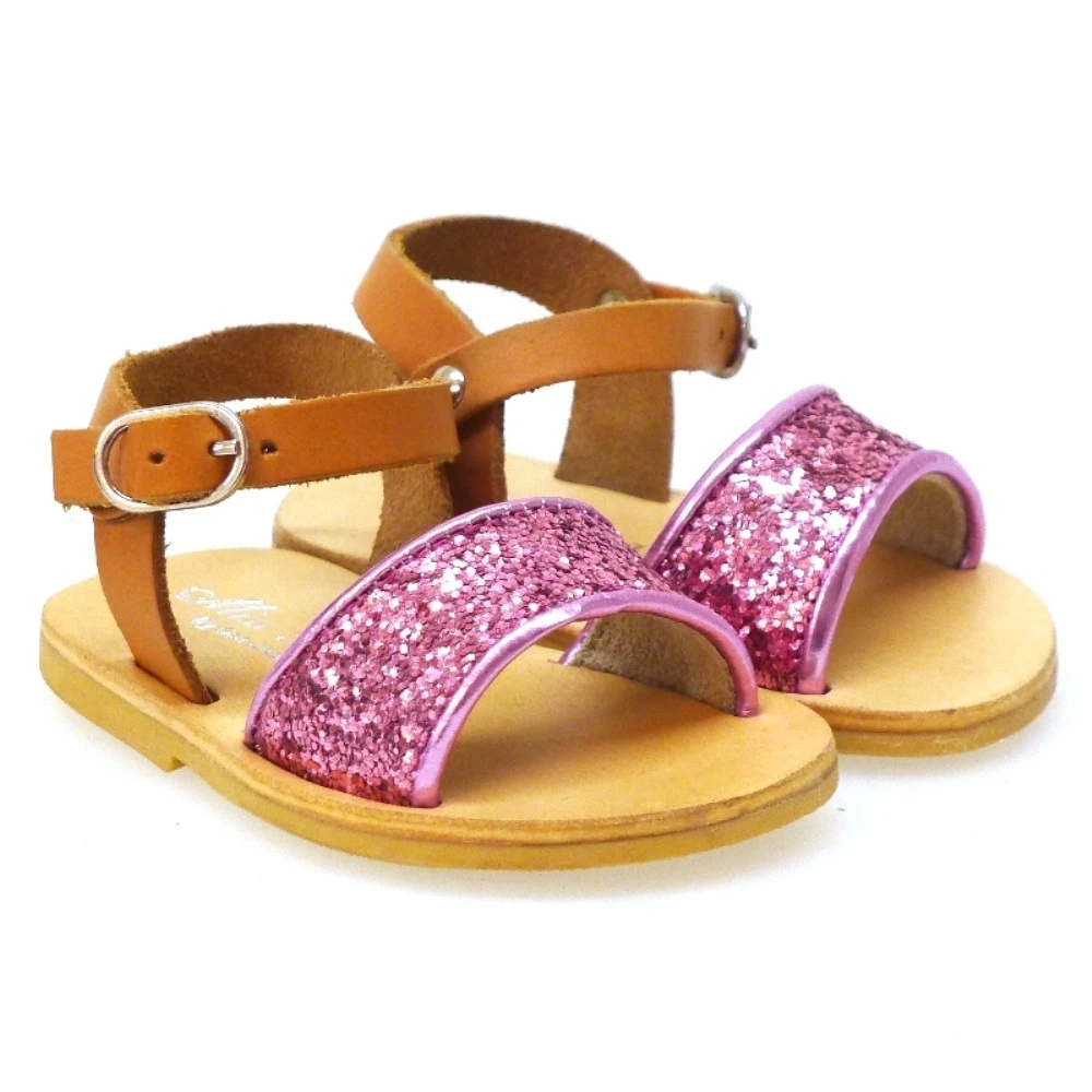 Disponible en diferentes colores, piel con glitter rosa y glitter oro, correa en cuero.Consejos de talla: Calzan el número.Una sandalia ideal para llevar con ropita más sport, fácil de combinar.