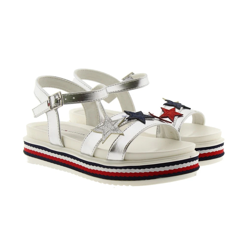 Esta sandalia para niña de la marca TOMMY HILFIGER juega con los colores característicos de la marca, azul y rojo en las tiras cruzadas de la pala y en la plataforma con logos. Llevan cierre de velcro en el empeine para mayor agarre. Las suelas son de goma antideslizante.