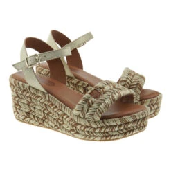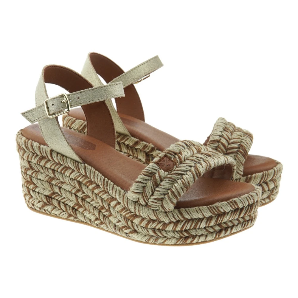 Sandalias trenzada en yute de POPA con plataforma media y abierta en la zona de los dedos. Compuesta por una tira en el enpeine de color dorado y hebilla para mayor sujección del pie. La suela es de piel acolchada. La cuña mide 8 cm y la plataforma 4 cm aproximadamente.