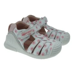 Vamos a darle color a los conjuntos de diario de tu bebé con estas sandalias tipo guarachas cerradas de la marca BIOMECANICS. Están fabricadas en piel muy suave con estampado de flores. Llevan la puntera reforzada para el gateo y el cierre de velcro para mayor sujeción. El interior es de piel con la plantilla extraible y la suela de goma antideslizante y ligera.