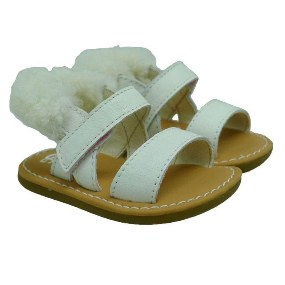 Sandalia para bebé niña de UGG con tiras en napa o en piel metalizada y cierre de velcro. Piel de olveja en el talón para mayor agarre. Plantilla de microfibra y suela de caucho.
