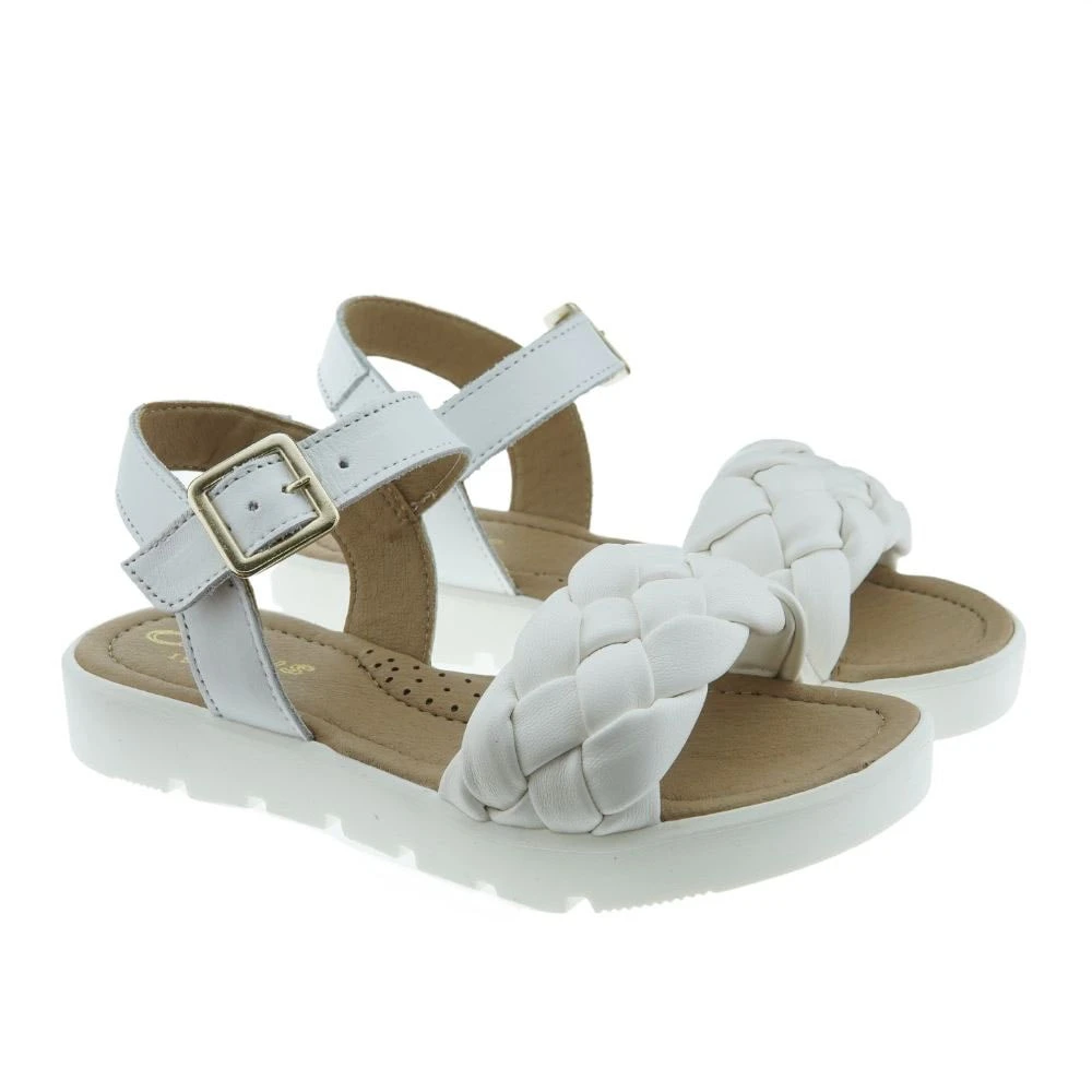 Con la pala en piel trenzada, estas sandalias de niña de la marca CLARYS son ideales para todos los dÃas. Llevan cierre de hebilla y formativo en la planta para mayor comodidad. La suela ancha es de goma antideslizante.
