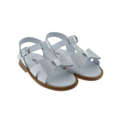Piel de charol blanco. Consejos de talla: Calzan el número. Estas sandalias son las que llevarán las niñas a diario este verano, tanto para un conjunto más informal como vestido. El color blanco combina con todo, y graicas al detalle del lazo, tienen ese toque más arreglado.
