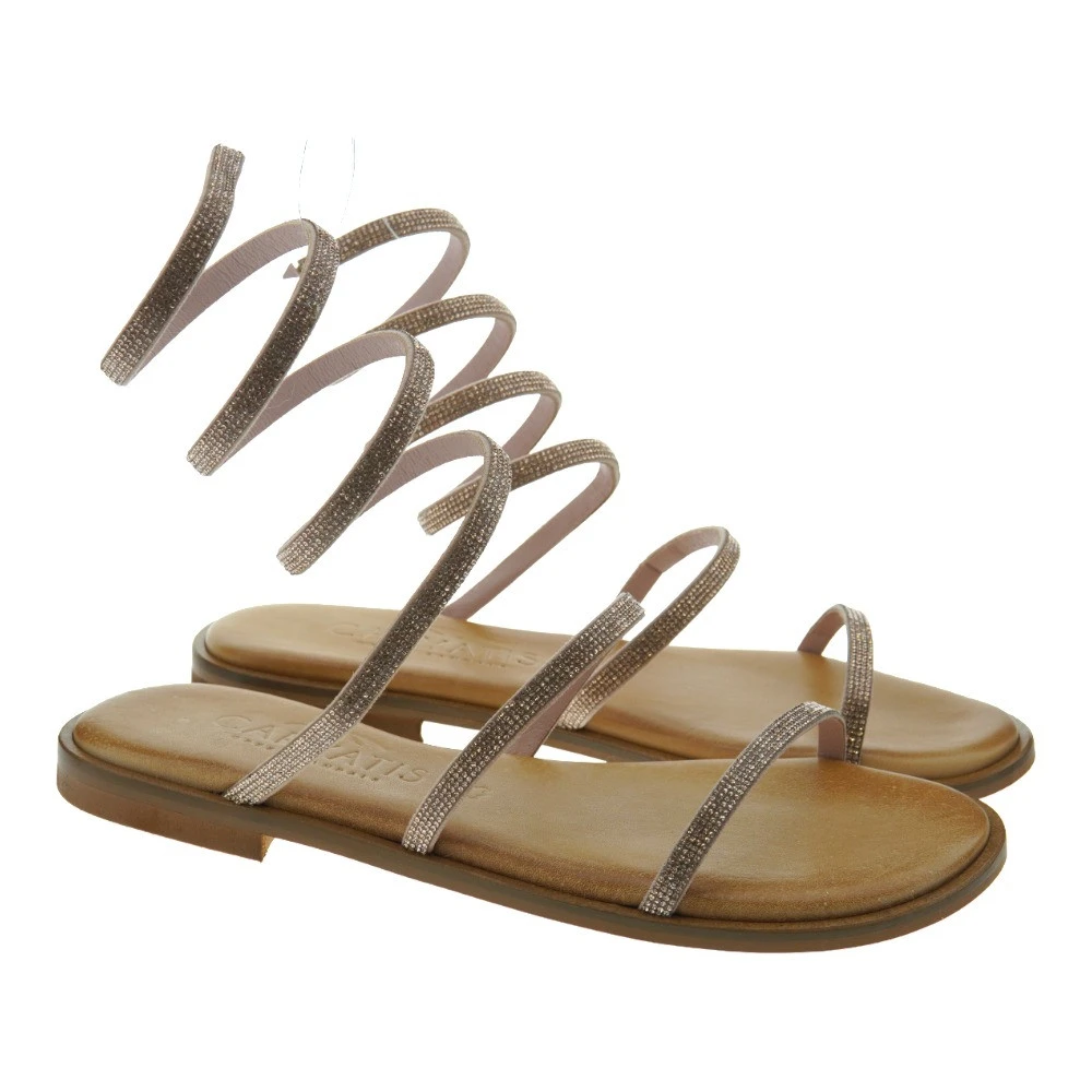 Este verano vuelven las sandalias tipo romanas y a diario llevaremos estas sandalias de CARYATIS con una tira en la pala y en el empeine y pulsera tipo serpiente alrededor del tobillo llenas de cristales. El interior es de piel y la suela antideslizante.