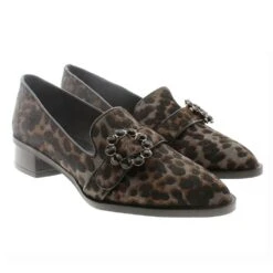Piel de pony con print animal en tonos negros. Consejos de talla: Calzan el número. Los slipper se renuevan en cuanto a pieles y colores y así lo vemos con estos zapatos de animal print tan de moda. Combínalos con looks en negro o marrón y llévalos para la oficina o para una tarde de compras.