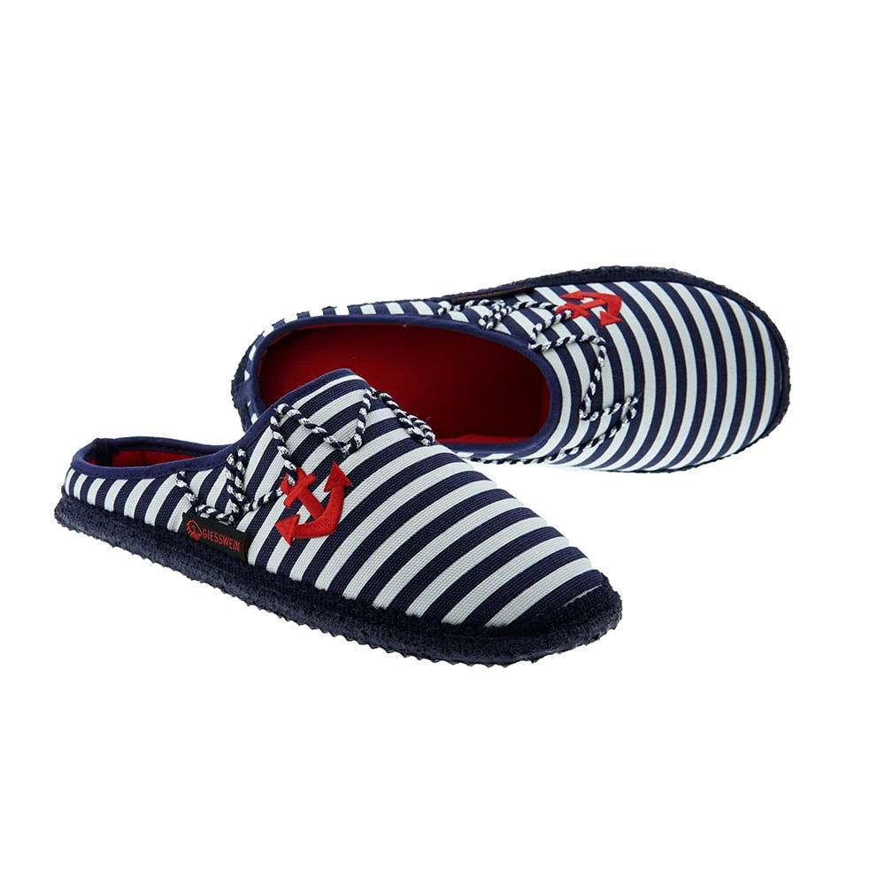 Lo que más nos gusta de las zapatillas de casa de GIESSWEIN, además de su calidad, son los estampados y dibujos que tienen. Estas zapatillas destalonadas para mujer están inspiradas en el mundo marinero con adorno de anclas. Están fabricadas con materiales naturales como el algodón y el caucho.