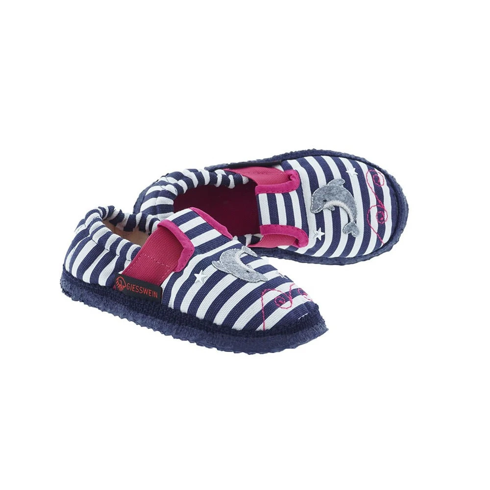 Algodón azul con blanco y con bordados de ballenas. Consejos de talla: Calzan el número. Protege los pies de tu hija en casa con las nuevas zapatillas de Giesswein. Un clásico de la marca austriaca, fabricadas con la mejor calidad. No llevan nada de pegamentos ni químicos, ya que el proceso es todo manual y encauchado.
