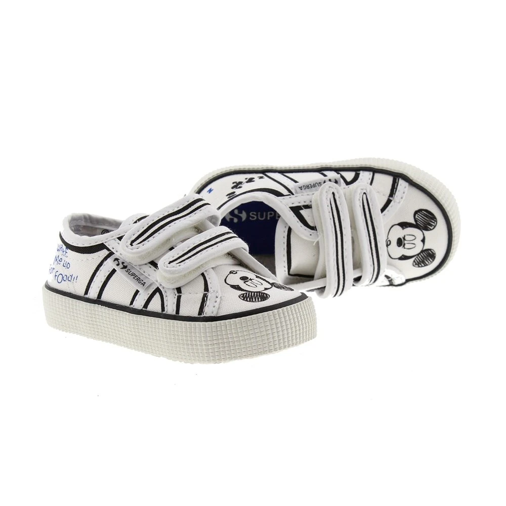 Zapatillas de algodón unisex para niño y niña de SUPERGA con dibujos de Mickey y logo de la marca en un lateral. Cierres de velcro. Forros y planta en algodón. Suela de caucho vulcanizado arrugado antideslizante.