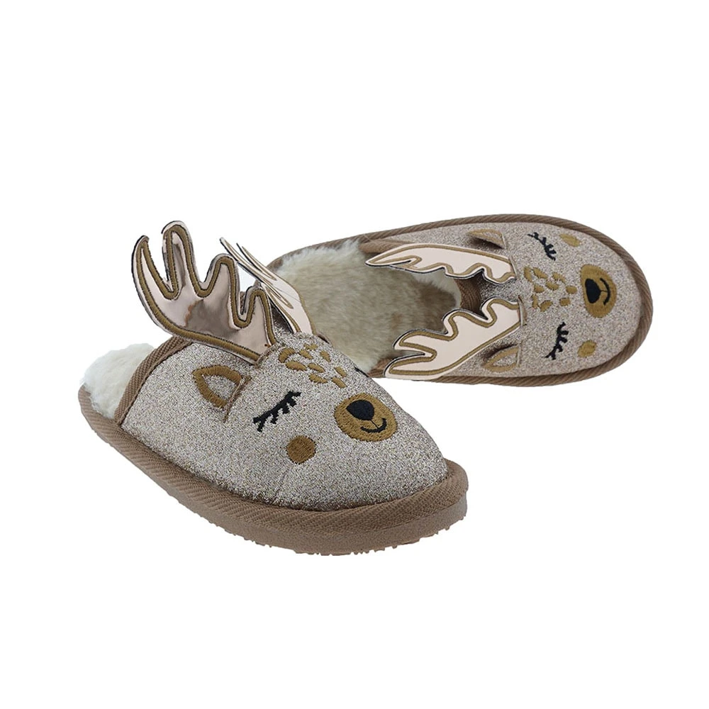 Estas zapatillas de casa para niña son muy originales gracias a la forma de reno. La marca CONGUITOS ha lanzado estas zapatillas para niña con los cuernos y la cara de un reno, fabricadas en microfibra con acabado glitter y forradas de pelo. La suela de goma aisla del frío.