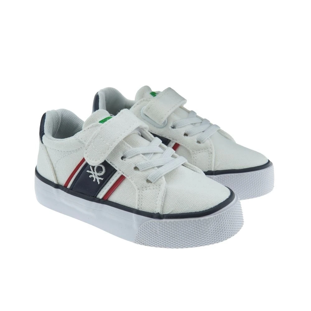 Tipo lona, estas zapatillas para niño de algodón de BENETTON las llevarán los niños a diario para el colegio y para el parque. Llevan cierre cómodo de cordón elástico y velcro y van adornados con el logo de la marca en los laterales. El interior es de algodón y la suela de goma antideslizante.