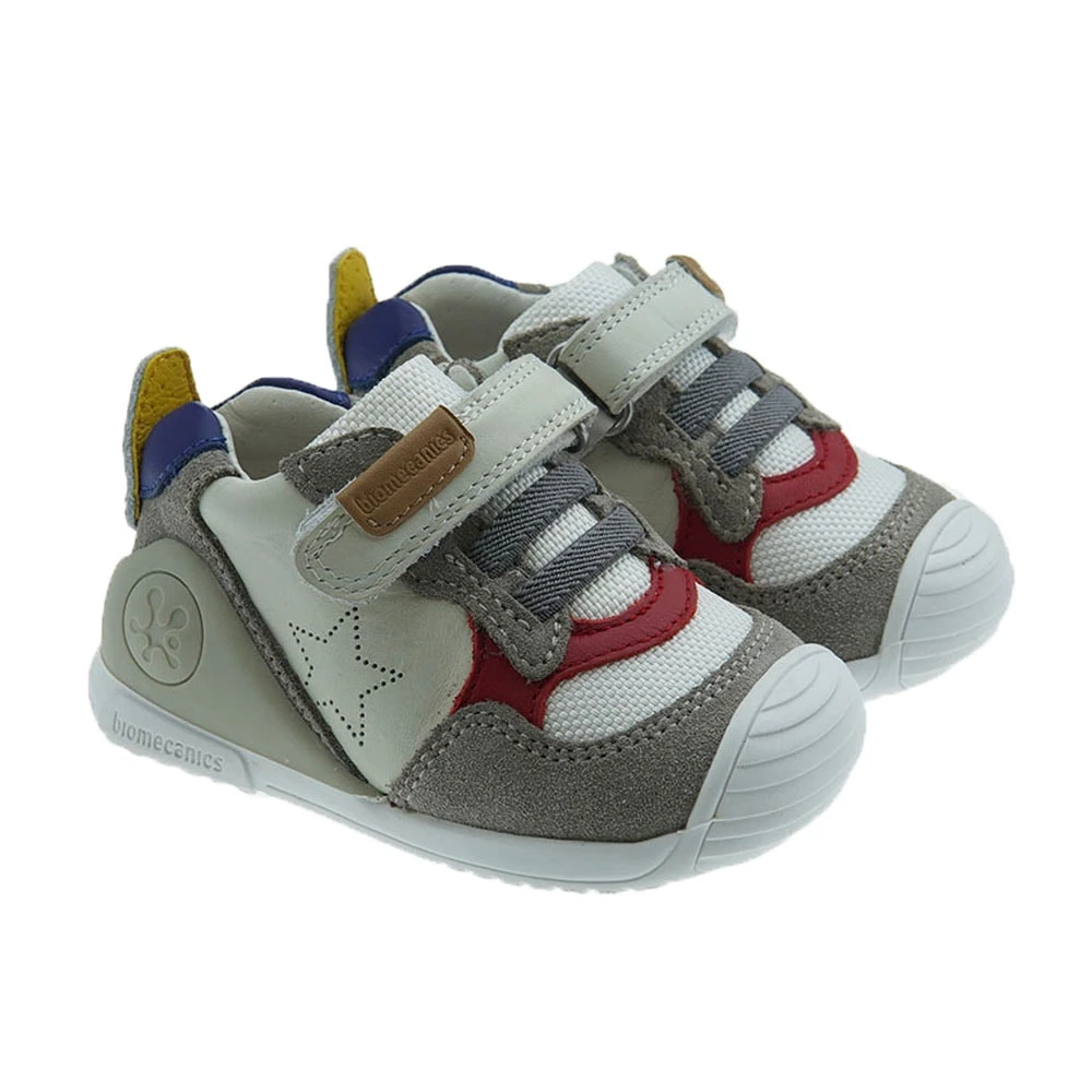 Estos zapatitos de sport para niño y niña de BIOMECANICS son los más adecuados para la etapa de gateo y primeros pasos. Estas zapatillas están fabricadas en piel con cierre de velcro y cordón elástico para mayor comodidad. Van decoradas con unas estrellas en los laterales y la puntera reforzada de goma. El interior es de piel y la suela de goma antideslizante.