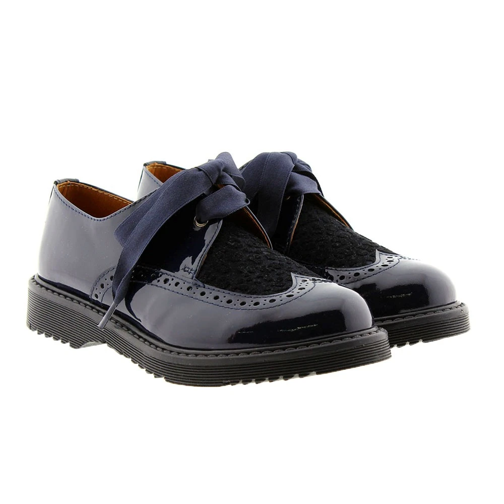Piel de charol azul. Consejos de talla: Calzan el número. Estos zapatos cerrados con cordón, quedan ideales con faldas y vestidos, combinados con unas medias o leotardos al tono. Un zapato para llevar el fin de semana o incluso a diaro para el colegio ya que tienen una suela ancha de goma y son fuertes y resistentes.