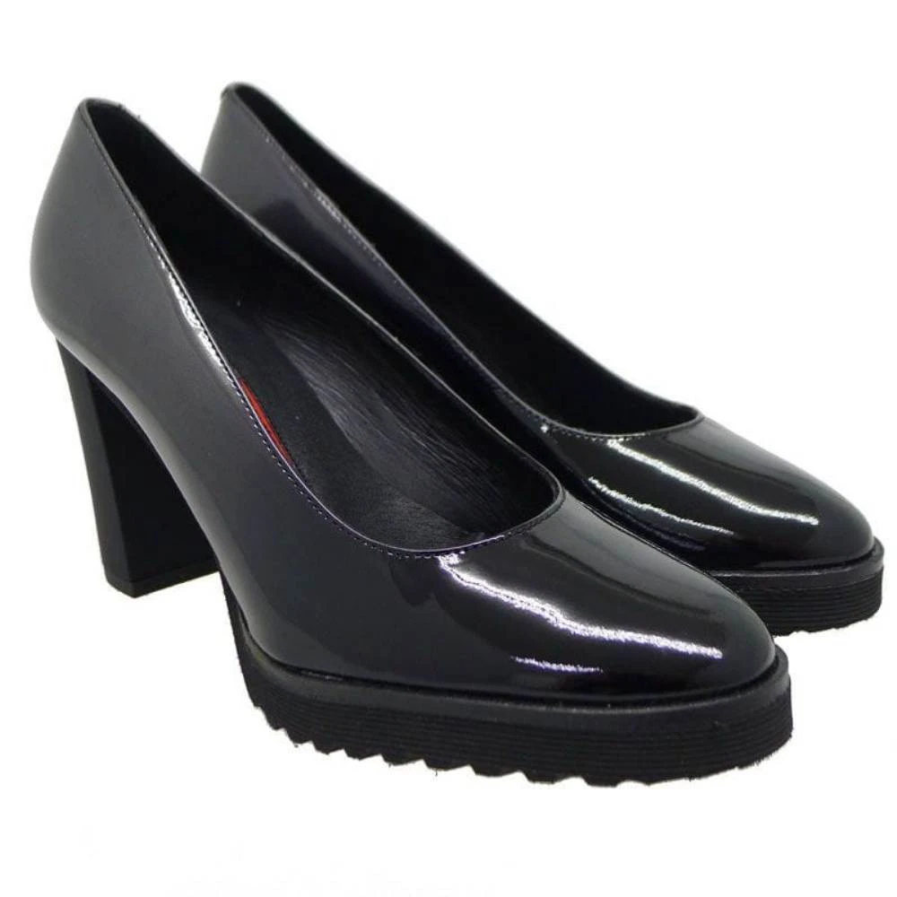 Zapato de salón de charol de PEDRO MIRALLES con tacón y plataforma. Forros y planta en piel. Tacón de 8 cm y plataforma de 1,5 cm aproximadamente.