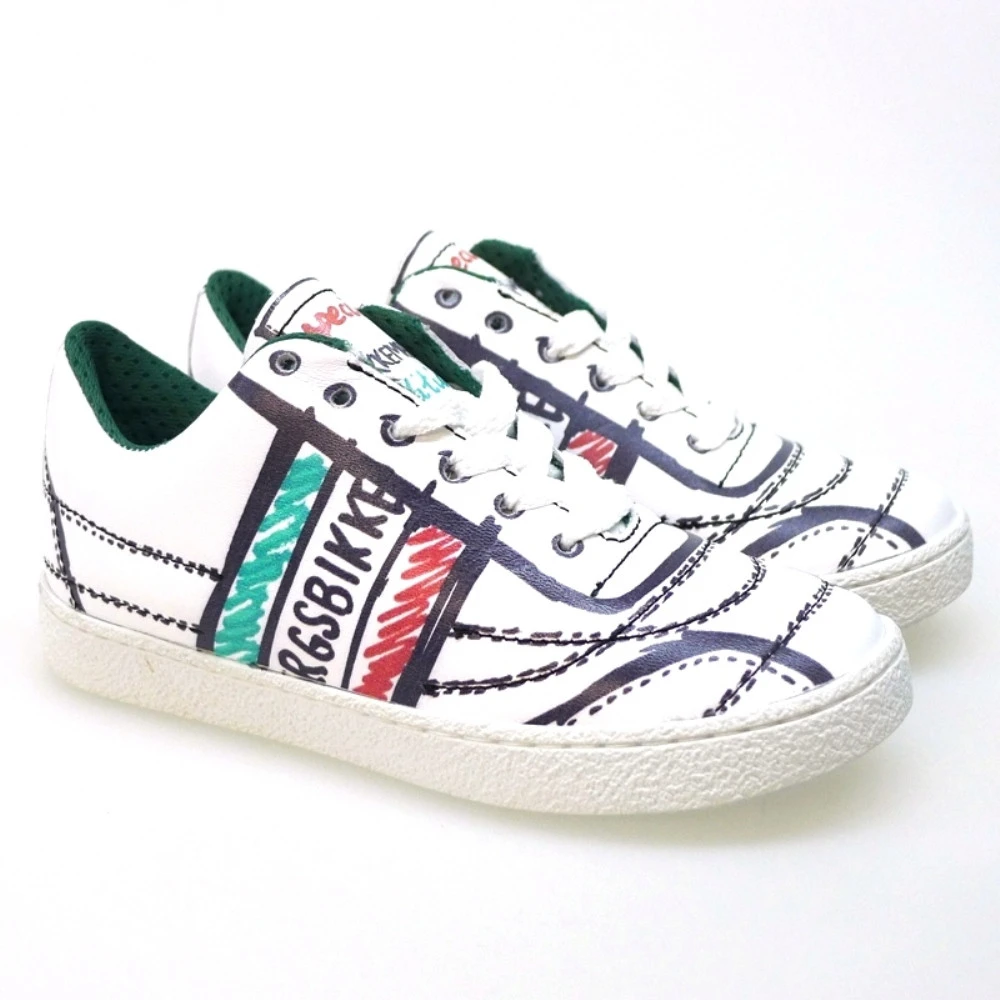 Piel napa blanca con bandas en verde y rojo. Consejos de talla: Calzan el número. Una edición especial de Bikkembergs para niños, que podrás combinar con vaqueros y ropa sport, pero siempre sin perder el estilo.