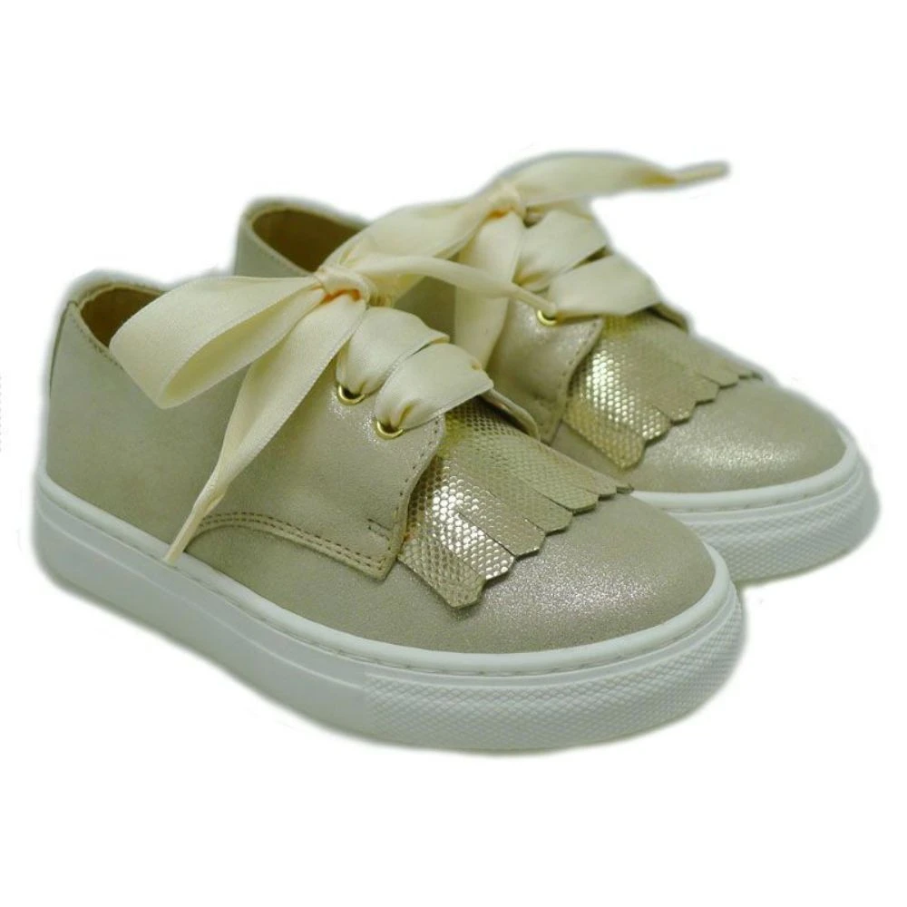 Disponible en diferentes coloes, piel metalizada oro con glitter multicolor y piel metalizada blanco con glitter plata. Consejos de talla: Calzan el número. Las zapatillas con adornos de lengüetas y detalles de brillantina se han convertido en un imprescindible del armario de las niñas. Con estas deportivas vestiremos sus pies a diario para ir al colegio combinadas con un vaquero, como el fin de semana con un vestido de punto. No te olvides de ellas esta primavera para llevar en cualquier momento de manera informal pero con un toque actual y a la última.