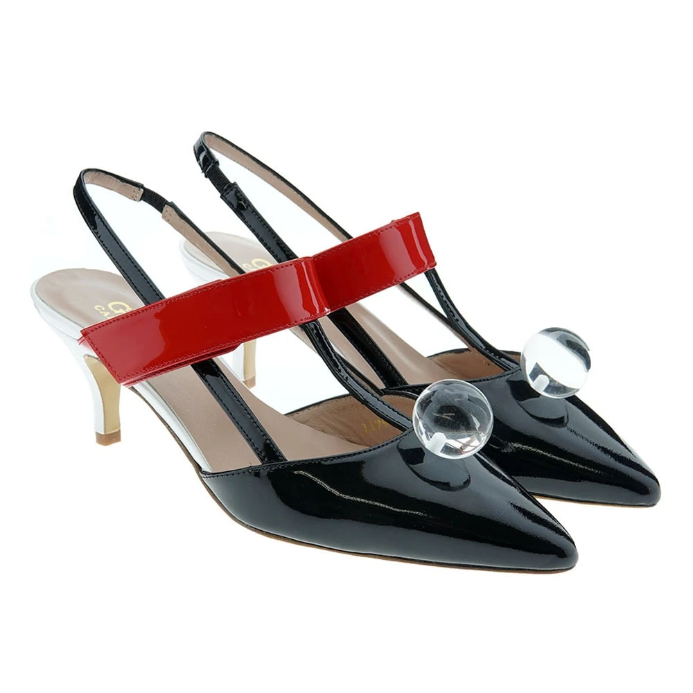 Disponible en diferentes colores, piel charol negro y rojo, negro y blanco, nude, fuxia y azul. Consejos de talla: Calzan el número. Para estilizar tus piernas y vestir, tan solo necesitas esta altura de tacón. Combina estos zapatos con tus looks working girl o para un look de noche con un vestido.