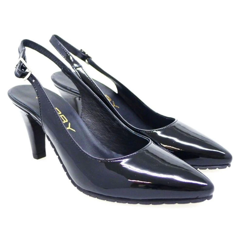 Con una altura de tacón media, estos zapatos de HOBBY los llevaremos a diario en la época de entretiempo. Los zapatos destalonados, son los más idóneos para la época en la que nos quitamos las botas y antes de pasar a las sandalias, buscamos un zapatos de entretiempo. Están hechos en piel de charol, acabados en punta y llevan ajuste de hebilla en la tira del talón. El interior es de piel transpirable. El tacón tiene una altura de 7 cm aproximadamente y la suela es de goma para que la pisada sea más confortable y lo resbalen.