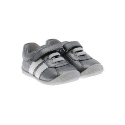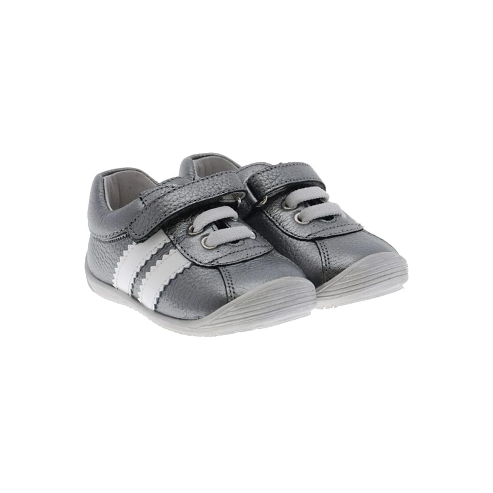 Disponibles en diferentes colores, piel metalizada acero con blanco y piel metalizada plata con blanco. Consejos de talla: Calzan el número. Un zapato de sport, pensado para llevar de diario a la guardería, y muy adecuado para empezar a caminar.