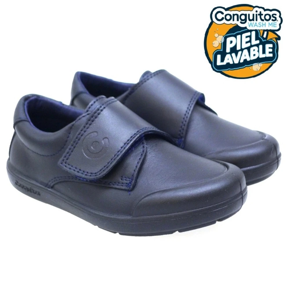Estos zapatos de uniforme para el colegio son muy fuertes y resistentes. CONGUITOS ha lanzado unos zapatos colegiales de piel lavable en lavadora, con puntera reforzada y con cierre de velcro para que se los puedan poner ellos solos. El interior también es de piel y lleva la plantilla extraible. La suela es de goma muy ligera, flexible y antideslizante.